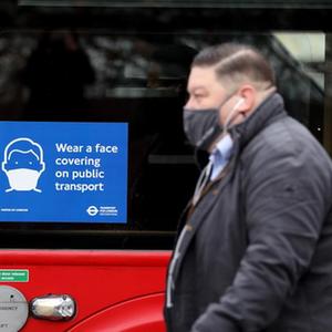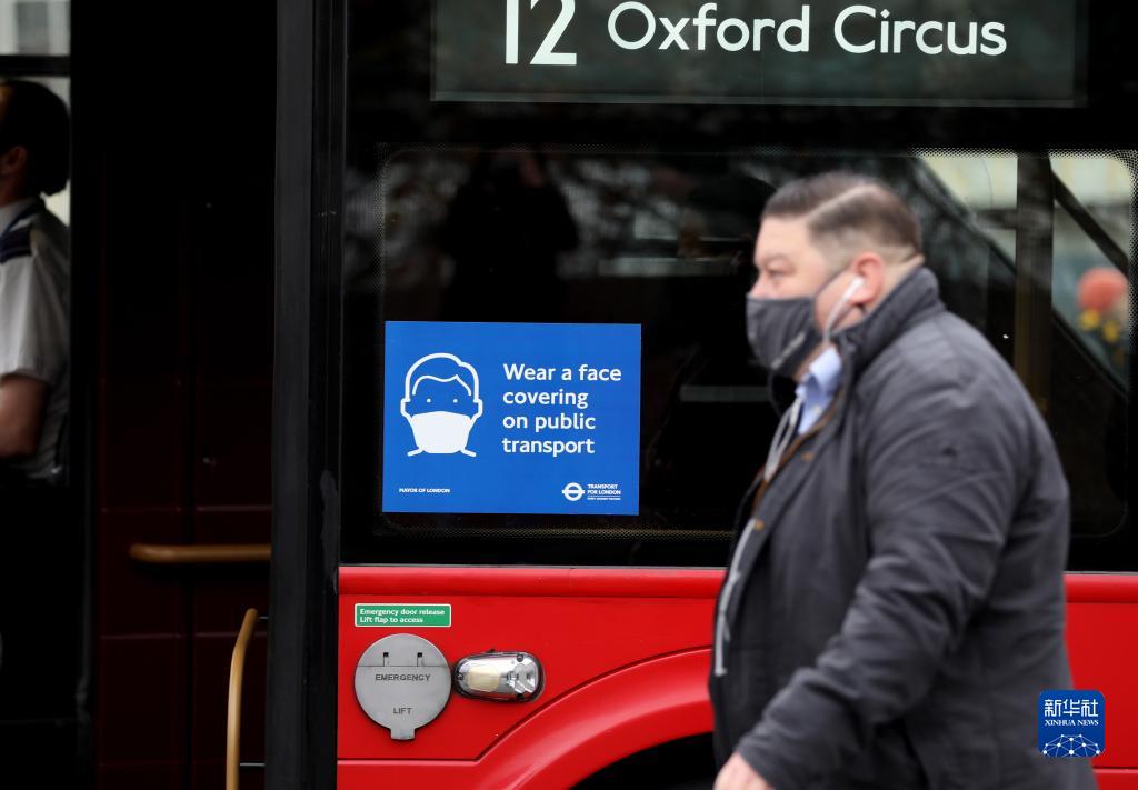 11月24日,英國倫敦的公共汽車上貼著提醒人們佩戴口罩的防疫告示。