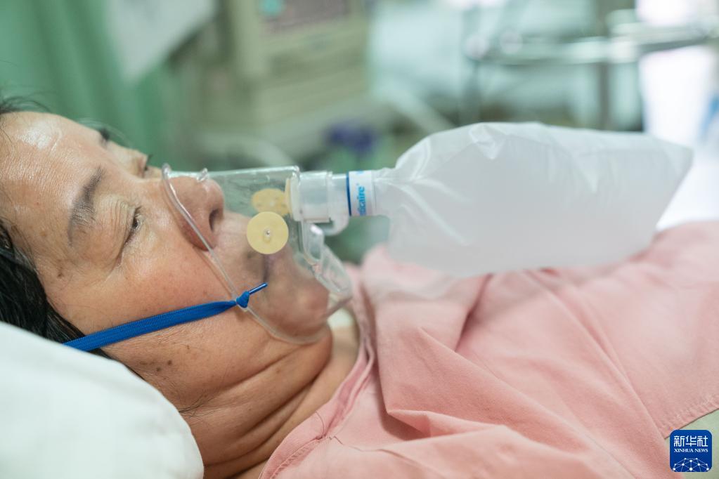 11月18日,在北京大學腫瘤醫院肝膽胰外一科病房,沈建群在手術后躺在病床上吸氧。
