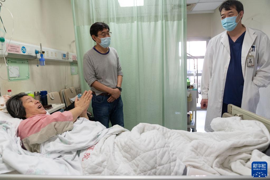11月24日,在北京大學(xué)腫瘤醫(yī)院肝膽胰外一科病房,即將出院的沈建群(左)向主治醫(yī)師包全致謝。