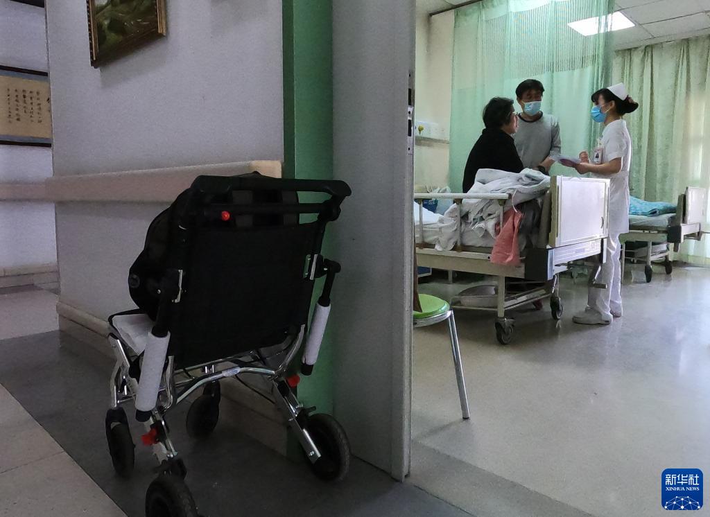 11月24日,在北京大學腫瘤醫院肝膽胰外一科病房,即將出院的沈建群(左)向護士了解出院手續。