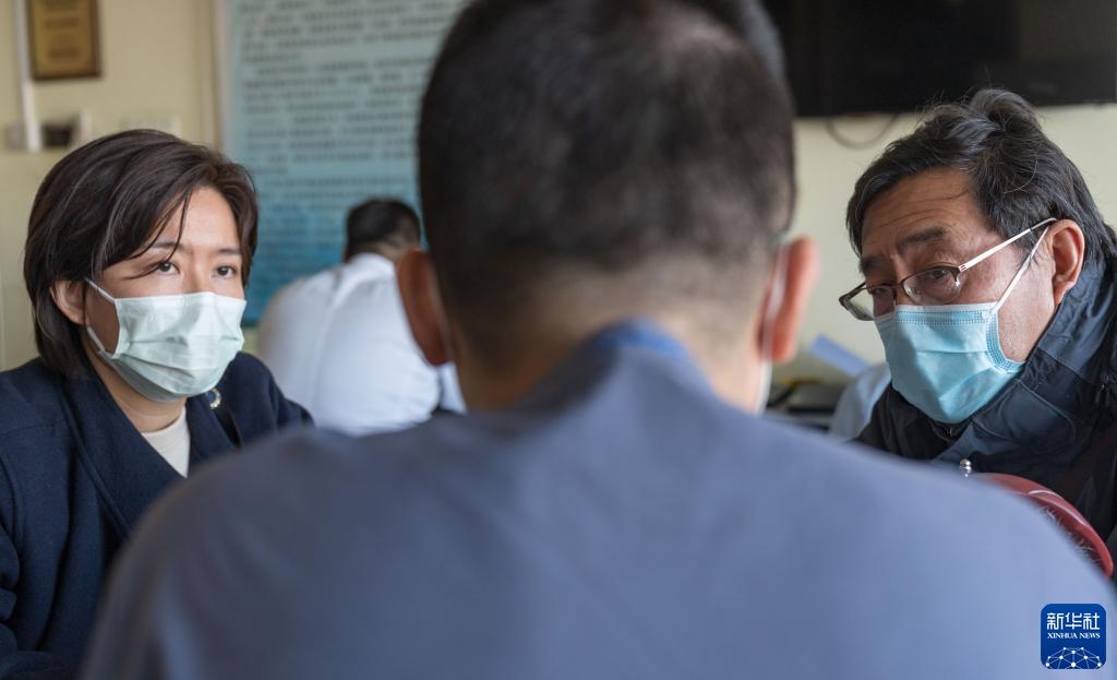 11月12日,在北京大學(xué)腫瘤醫(yī)院肝膽胰外一科病房,沈建群的老伴兒吳友文(右)、女兒吳姝(左)聽主治醫(yī)師閆曉巒講述手術(shù)可能遇到的風(fēng)險。