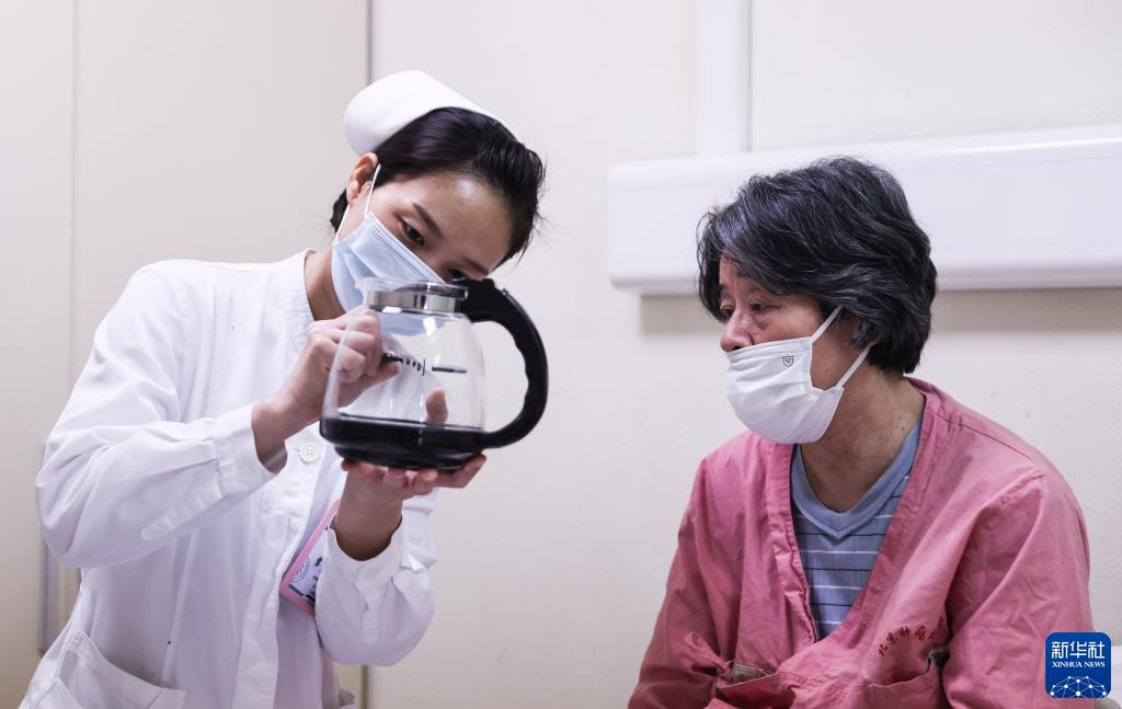 11月12日,在北京大學(xué)腫瘤醫(yī)院肝膽胰外一科病房,主管護(hù)士馬婧臣與沈建群交流。