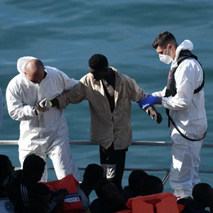 11月24日,在馬耳他森格萊阿,工作人員幫助獲救的非法移民上岸。