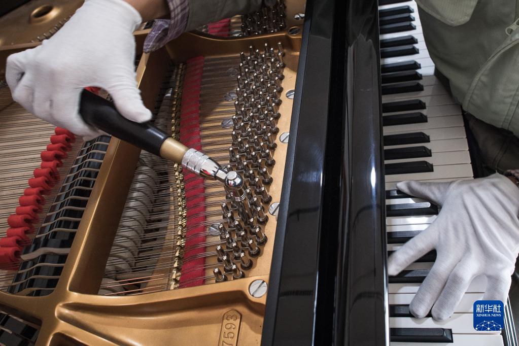 11月23日,工人在柏斯音樂集團宜昌鋼琴生產基地調試鋼琴。