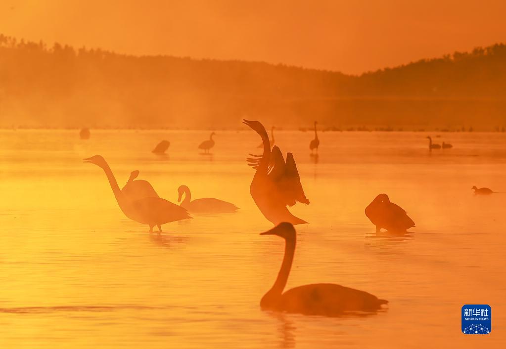 冬日清晨,山東榮成大天鵝國家級自然保護區晨霧裊裊,大天鵝在晨曦中游弋覓食、起舞飛翔,吸引眾多游客前來觀賞拍照。