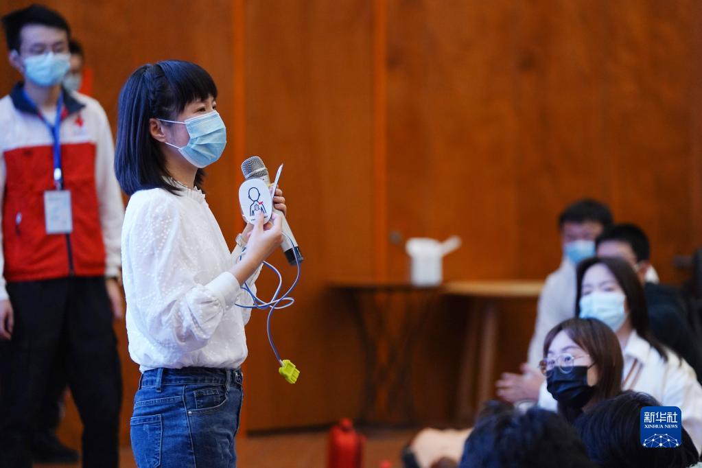 11月28日,清華大學醫院醫生李晶鈴(前)在為學生志愿者講授自動除顫器的使用方法。新華社記者 鞠煥宗 攝
