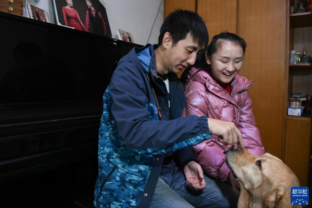 12月2日,在位于安慶市的家中,唐聞澤、張晨和領養的導盲犬在一起。