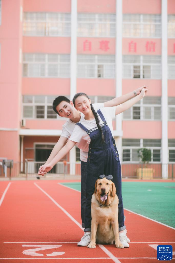 唐聞澤、張晨和領養的導盲犬在安慶市特殊教育學校內合影(2016年6月4日攝,受訪者提供)。