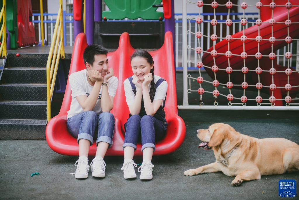 唐聞澤、張晨和領養的導盲犬在安慶市特殊教育學校內合影(2016年6月4日攝,受訪者提供)。