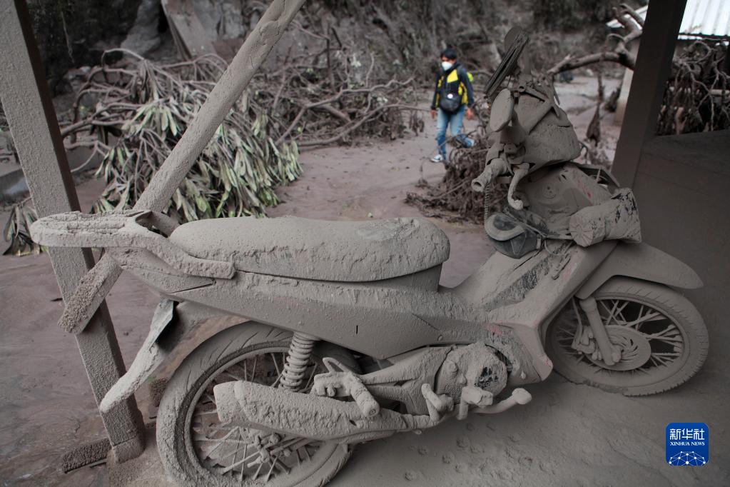 這是12月5日在印度尼西亞爪哇島東部盧馬姜拍攝的被火山噴發物覆蓋的摩托車。