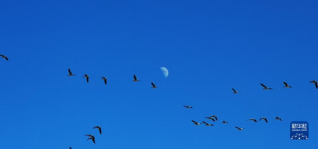 一群候鳥飛過唐嘎濕地(12月11日攝,手機照片)。