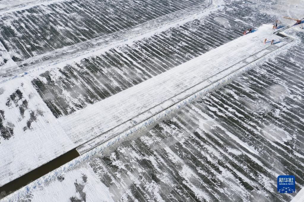 這是12月17日拍攝的松花江哈爾濱段被切割過的江面冰層(無人機照片)。