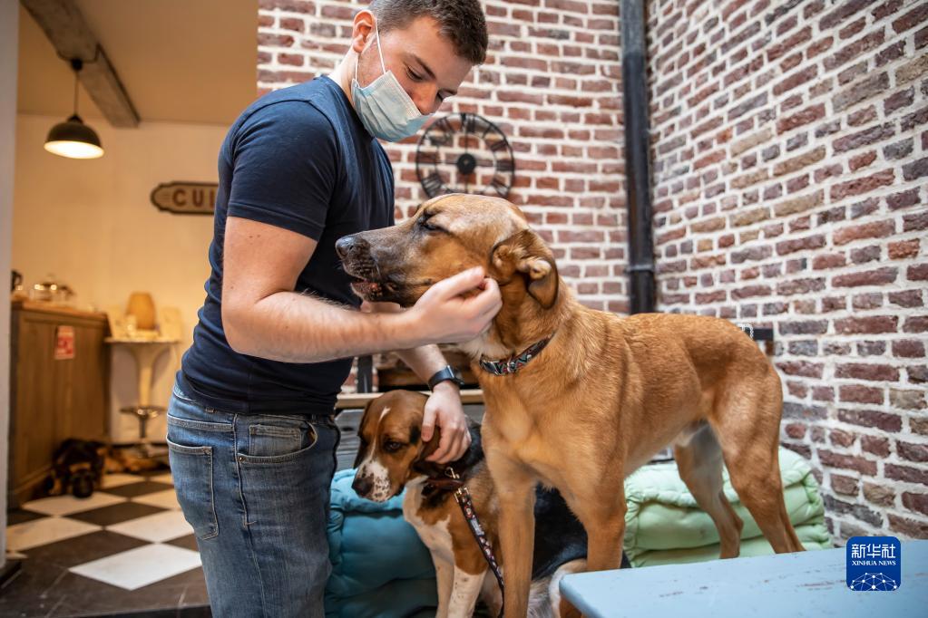12月22日,在法國北部城市里爾名為Waf Cafe的咖啡館,顧客與狗狗互動(dòng)。