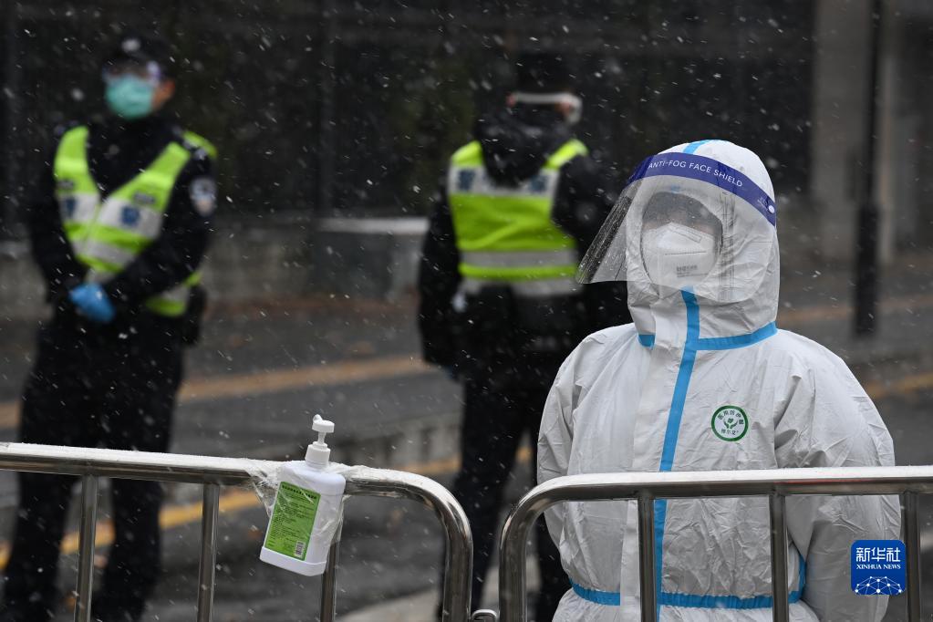 12月25日,防疫人員在風(fēng)雪中堅守崗位。