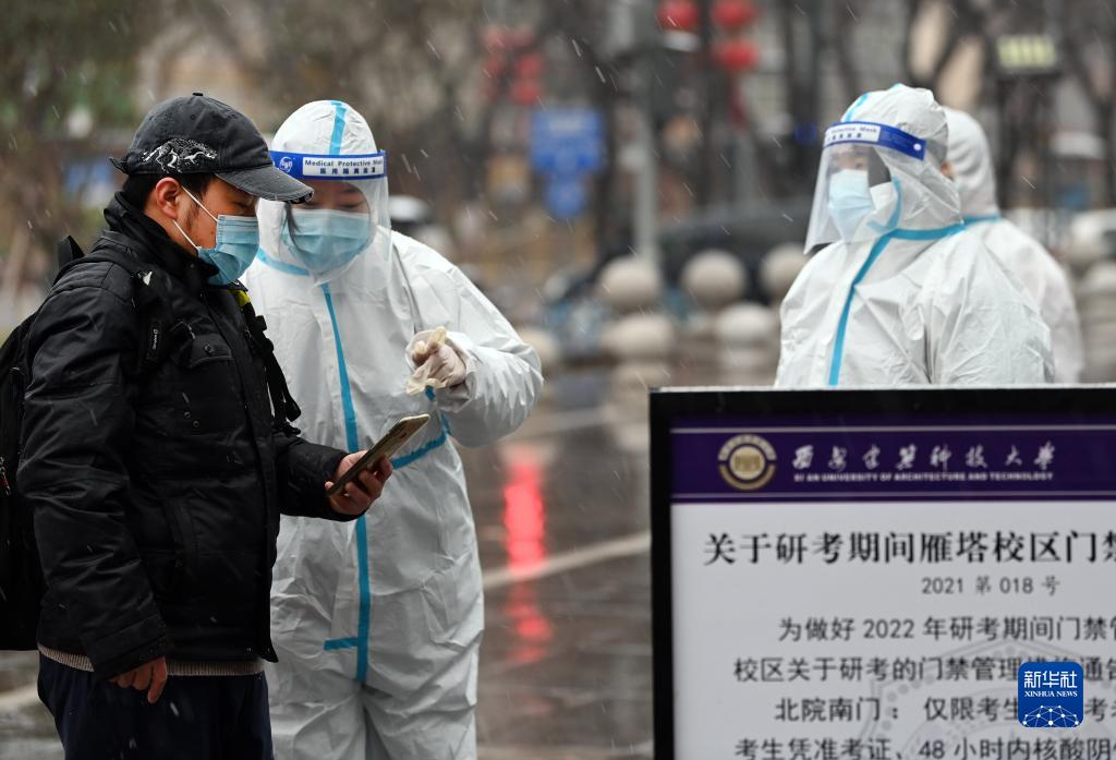 12月25日,防疫人員查看研考生(左一)的核酸檢測結果。當日在西安市參加考試的考生約13.5萬人,他們將在各方保駕護航下,帶著希望與夢想奔赴各考點。