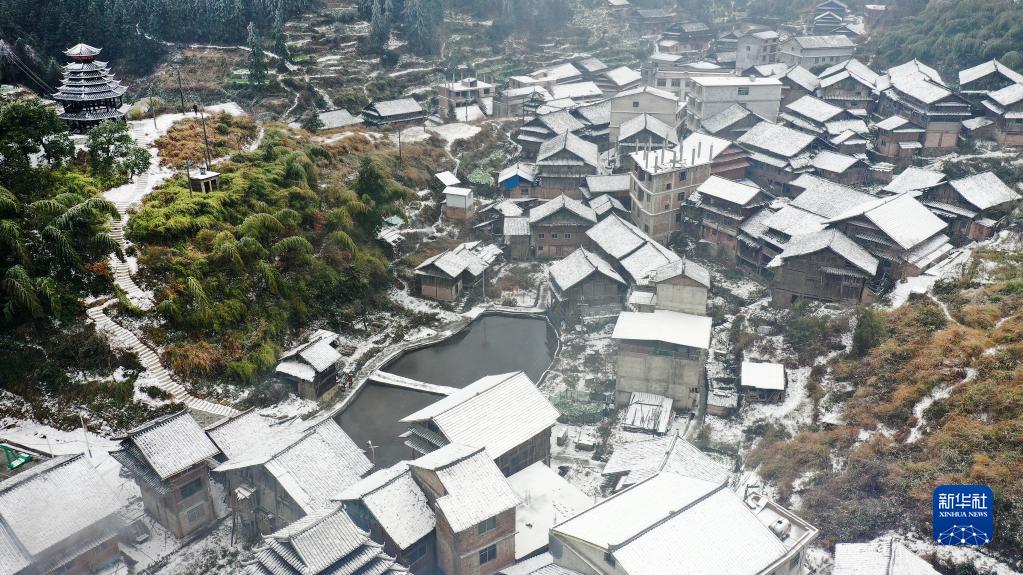 12月28日在廣西柳州市三江侗族自治縣獨峒鎮玉馬村拍攝的雪景(無人機照片)。