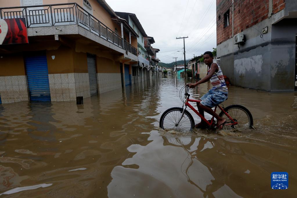 12月28日,一名男孩騎著自行車在巴西巴伊亞州達里烏梅拉市被洪水淹沒的街道上出行。