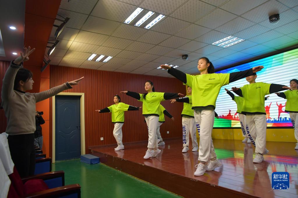 在江西省宜春市特殊教育學(xué)校,樊海艷(左一)指導(dǎo)聽障班的學(xué)生們排舞(12月28日攝)。