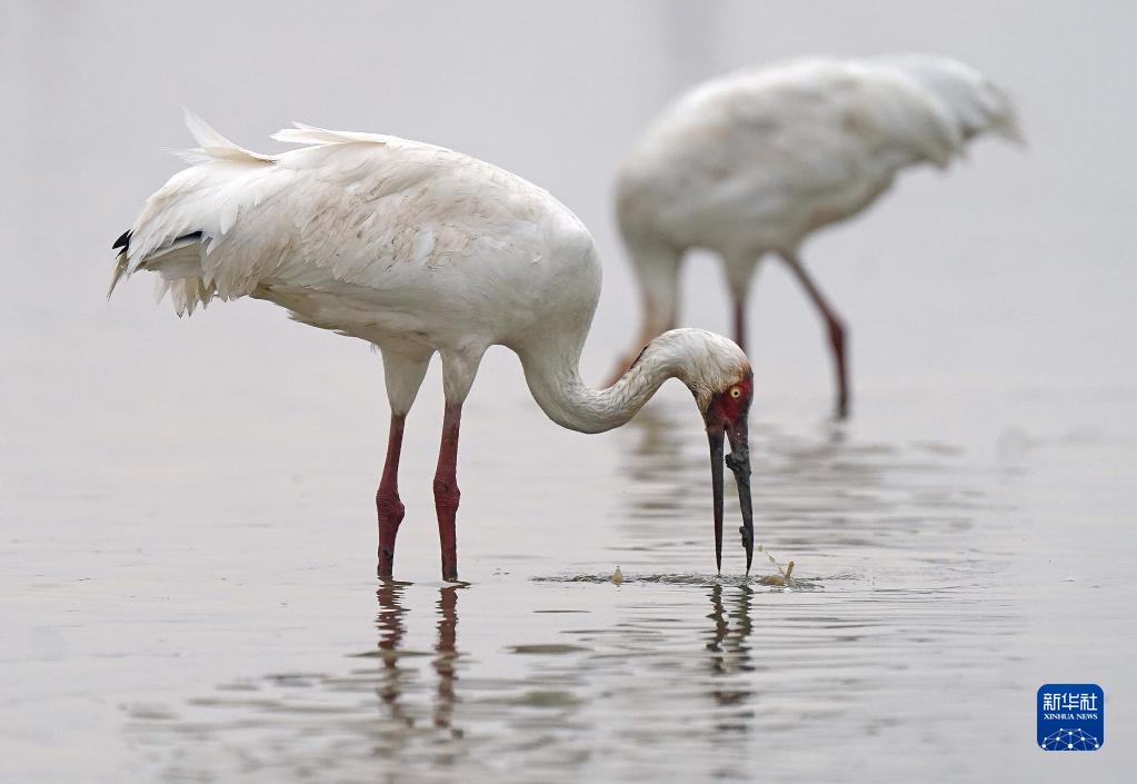 白鶴在濕地覓食(1月1日攝)。新華社記者 萬象 攝
