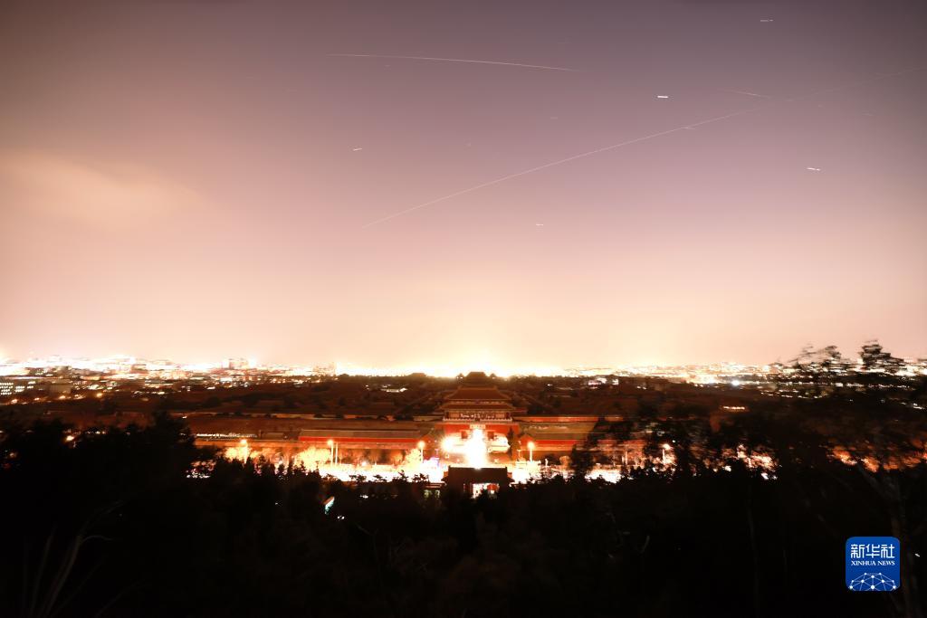 2021年12月21日拍攝的中國空間站從北京故宮上空飛過的照片(下面的線為中國空間站,軌跡為多張照片堆棧)。