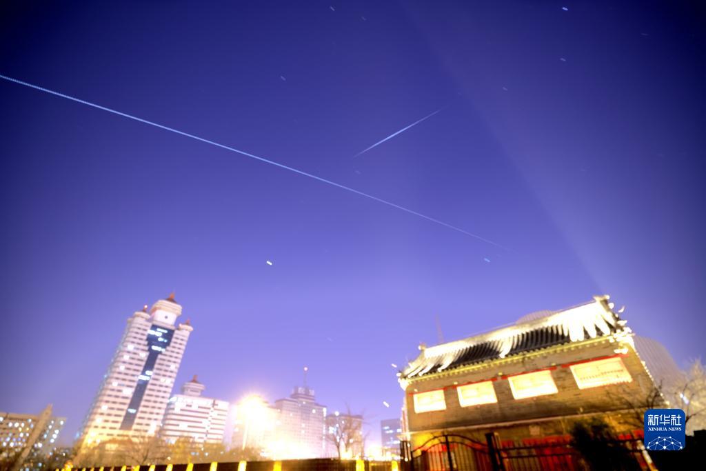 2021年12月19日,在北京西便門(mén)拍攝的中國(guó)空間站過(guò)境照片(軌跡為多張照片堆棧)。