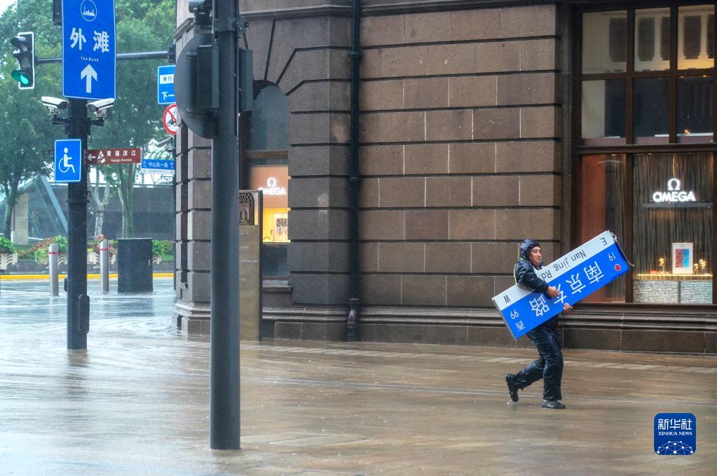 2021年7月25日,工作人員在上海街頭搬運因臺風“煙花”被吹落的路牌。