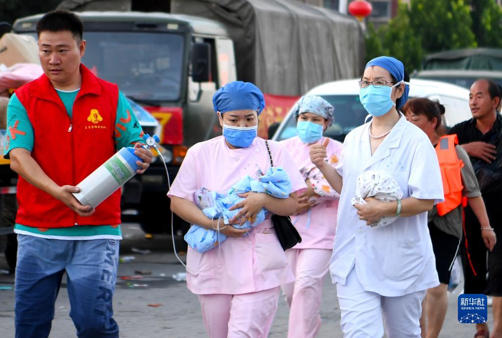 2021年7月26日,在被洪水圍困的河南省衛輝市新鄉醫學院第一附屬醫院附近,醫護人員抱著新生兒跑向救護車。