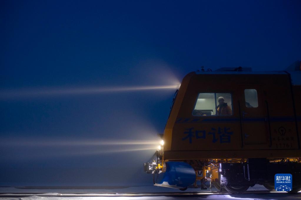 2021年1月21日,軌道除雪車載著工人緩緩駛出鐵廠溝維修工隊的車庫。克(克拉瑪依市)塔(塔城市)鐵路是新疆塔城地區的交通要道。克塔鐵路穿越“魔鬼風區”瑪依塔斯。中國鐵路烏魯木齊局集團有限公司阿勒泰基礎設施段額敏綜合維修車間鐵廠溝維修工隊駐守在這里。他們24小時待命,負責鐵軌維修養護等工作,保障來往列車安全通行。