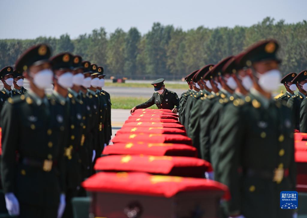 2021年9月2日,第八批在韓中國人民志愿軍烈士遺骸由我空軍專機護送從韓國接回遼寧沈陽,109位志愿軍烈士英靈及1226件相關遺物回到祖國懷抱。這是在沈陽桃仙國際機場,禮兵在殮放志愿軍烈士遺骸的棺槨上覆蓋國旗。