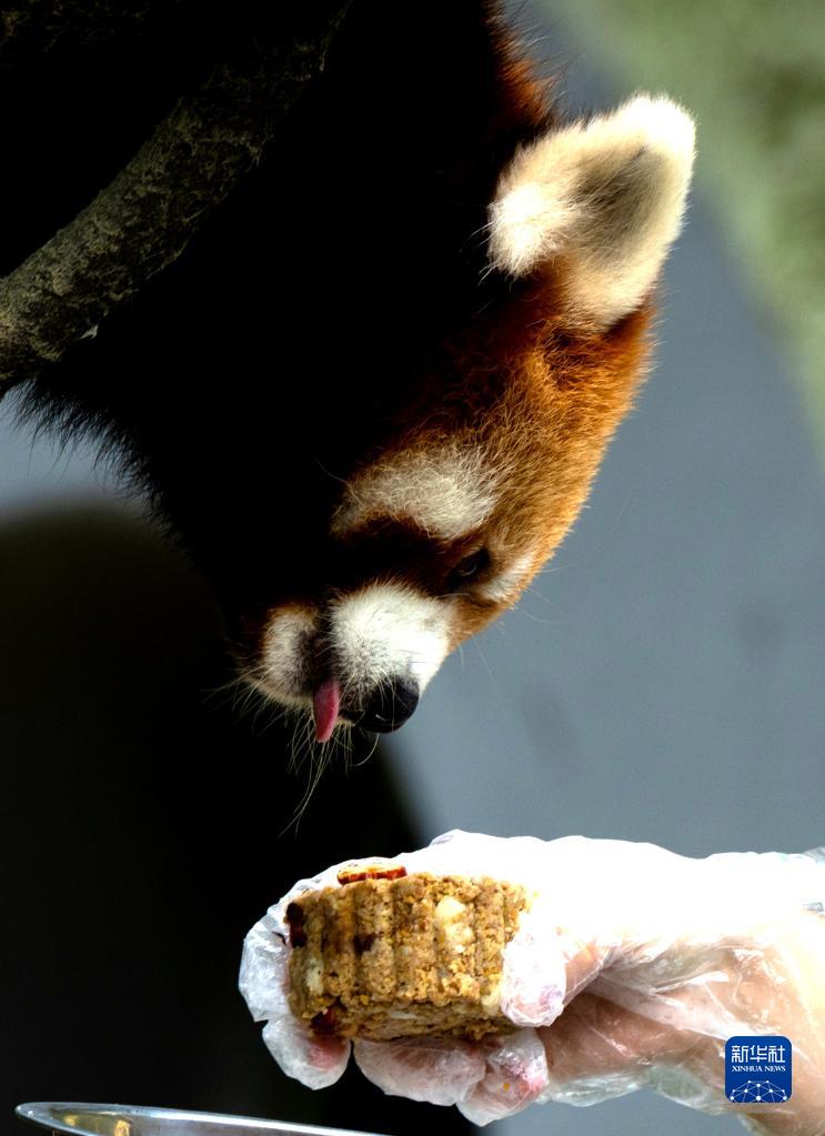 2021年9月20日,在中秋節(jié)來臨之際,上海動(dòng)物園一只小熊貓準(zhǔn)備吃“月餅”。