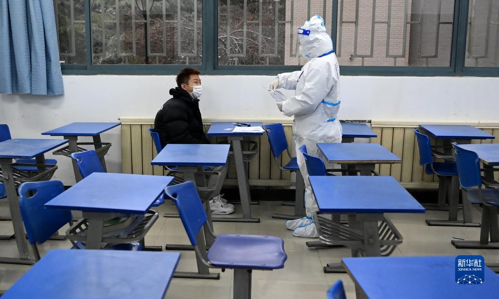 2021年12月25日,在2022年全國碩士研究生招生考試西安外國語大學考點隔離考區,監考人員在單人隔離考場查看考生信息。