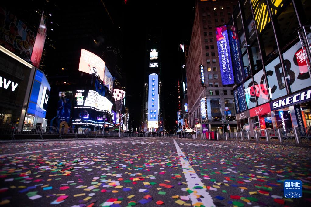 2021年1月1日凌晨,美國紐約時報廣場空空蕩蕩。受新冠疫情影響,2021年時報廣場跨年慶祝活動不對普通觀眾開放,只通過電視和線上轉播,以避免人群聚集。