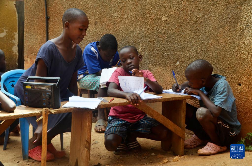 2021年6月14日,在烏干達首都坎帕拉,因新冠疫情無法到校上課的小學生利用收音機收聽無線電廣播的教學內容。