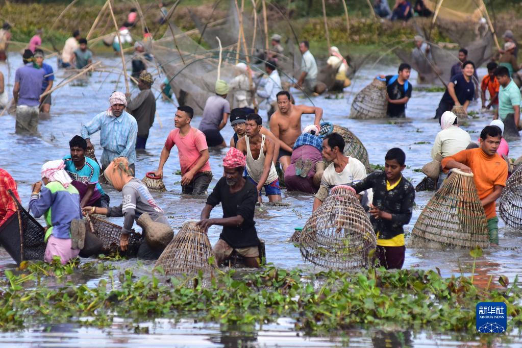 1月13日,在印度阿薩姆邦高哈蒂一處村莊,當地村民參加捕魚活動,慶祝收獲季的結束。新華社發