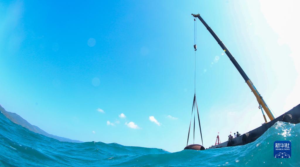 在亞龍灣相關(guān)海域,船上機(jī)械將人工生態(tài)礁吊入海中(1月19日攝)。
