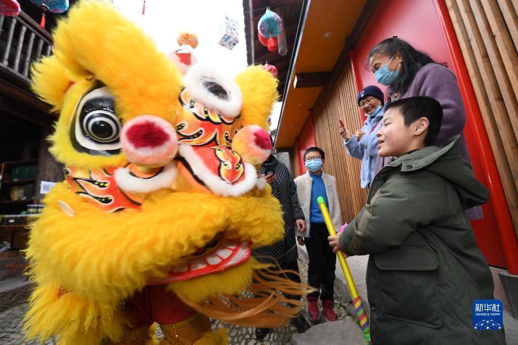 1月20日,在前童古鎮(zhèn)老街上,正在訓(xùn)練的舞獅隊員和小游客互動。