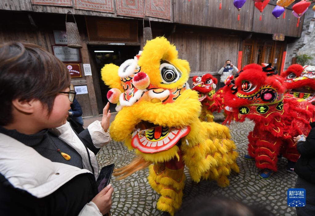 1月20日,在前童古鎮(zhèn)老街上,正在訓(xùn)練的舞獅隊(duì)和游客互動(dòng)。
