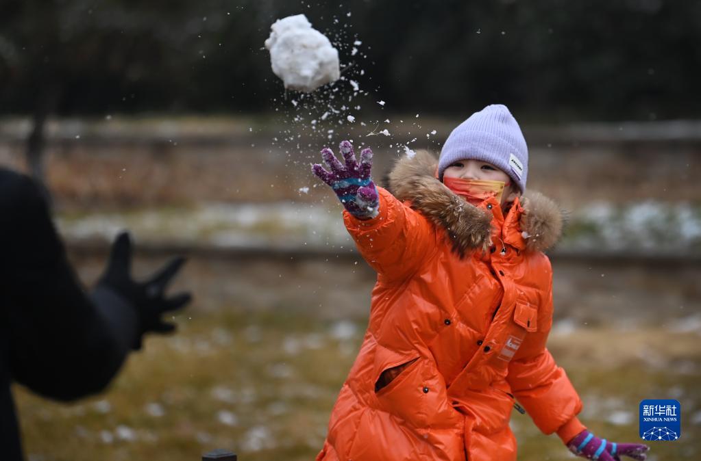 1月23日,小朋友在街頭與家人打雪仗。