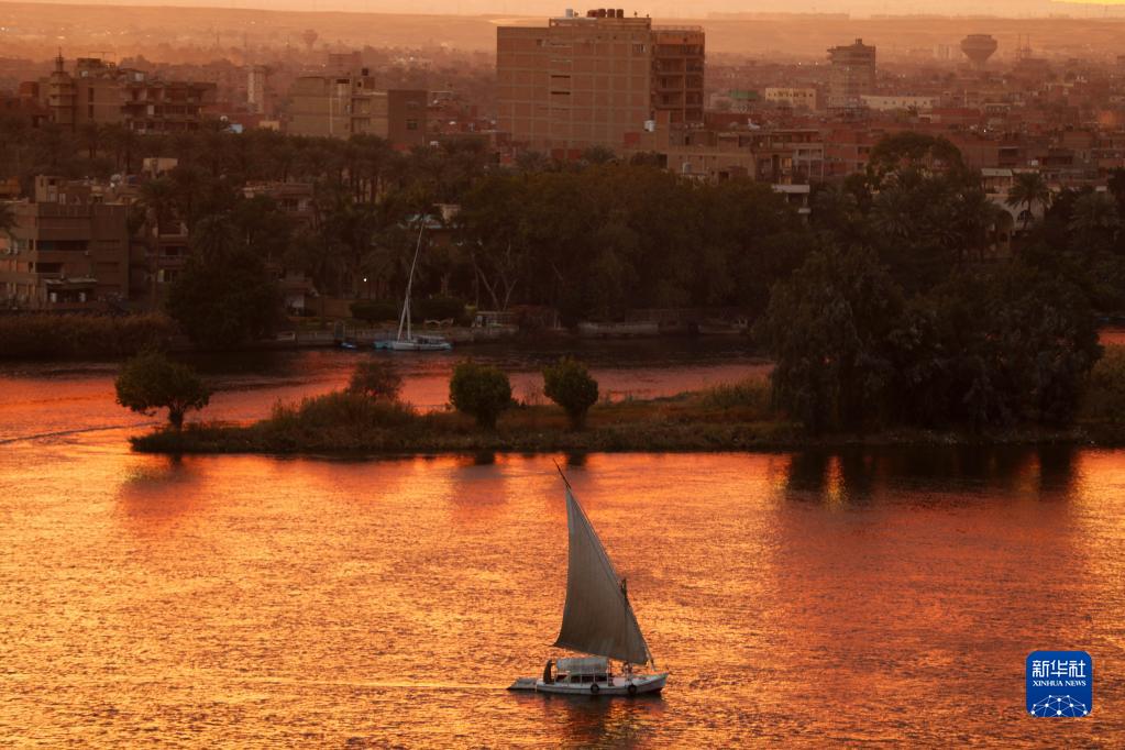 1月26日,一艘帆船行駛在埃及開羅被霞光映紅的尼羅河上。
