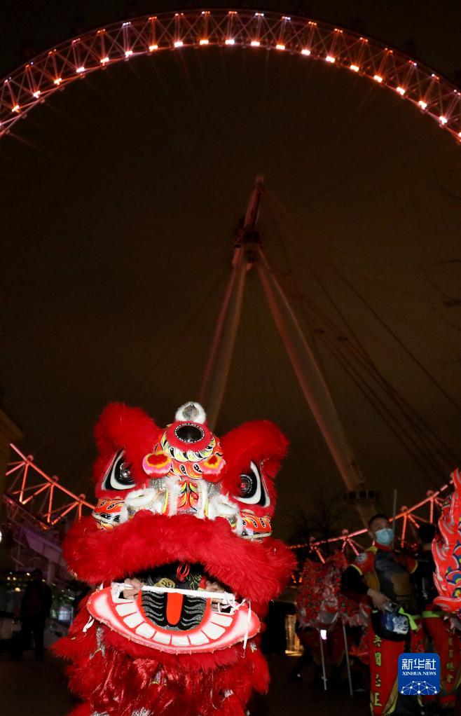 1月28日,在英國倫敦,演員在亮起“中國紅”的“倫敦眼”前表演舞獅。