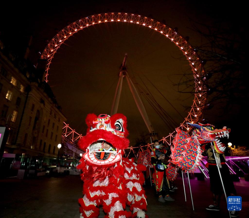 1月28日,在英國倫敦,演員在亮起“中國紅”的“倫敦眼”前表演舞獅。
