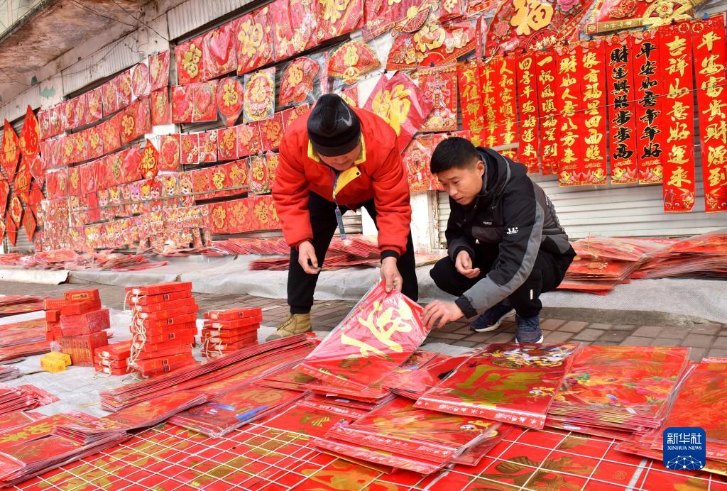 1月31日,在河北省邢臺市南和區(qū)的集貿(mào)市場,宋建飛(右)在采購春聯(lián)。
