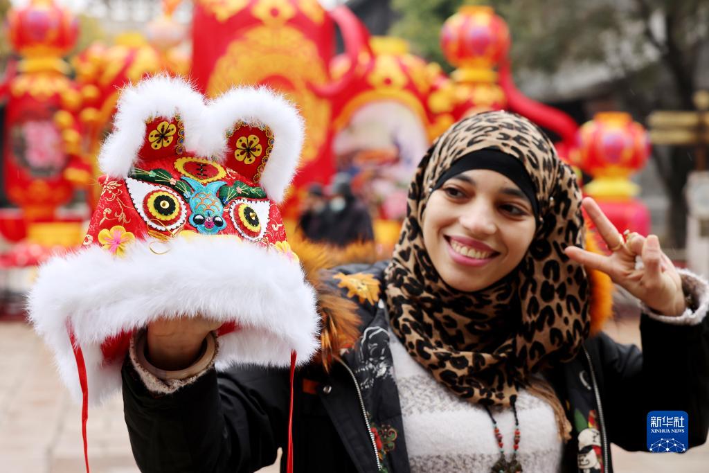 1月22日,來自埃及的“洋媳婦”艾米娜在山東省棗莊市臺兒莊古城展示中國傳統虎頭帽。艾米娜已嫁到臺兒莊10多年,喜愛中國的傳統文化。