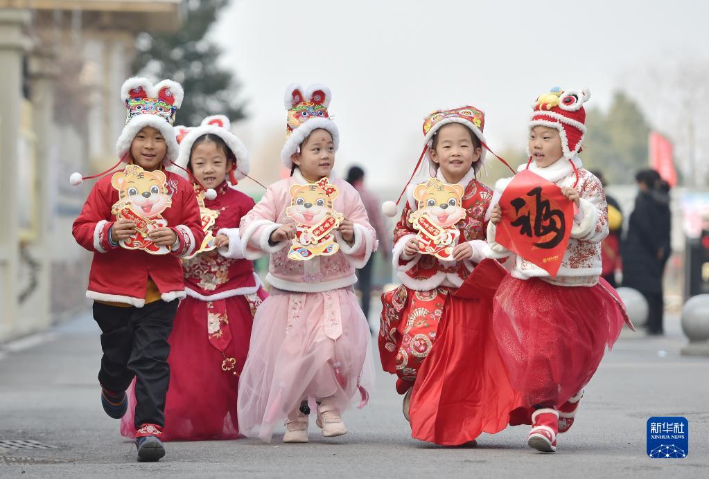 1月18日,在安徽省合肥市源水家園小區,頭戴虎頭帽的小朋友們手持“福”字和卡通吉祥物。
