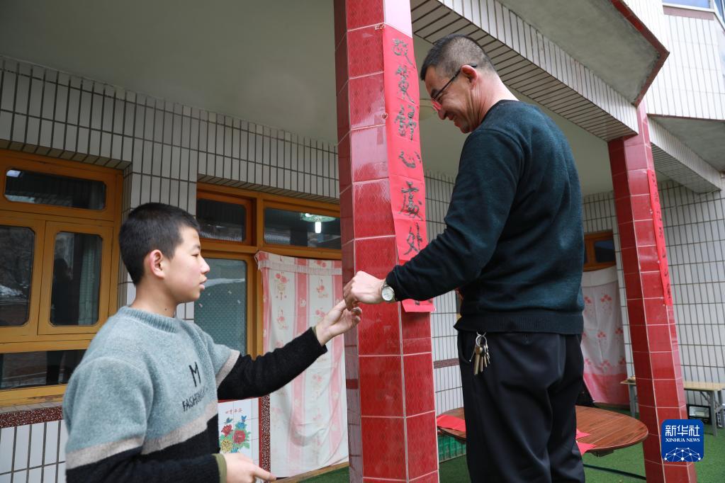 在蘭州市七里河區(qū)西果園鎮(zhèn)袁家灣村,村民馬明禎(右)和兒子在家中一起貼春聯(lián)(1月26日攝)。