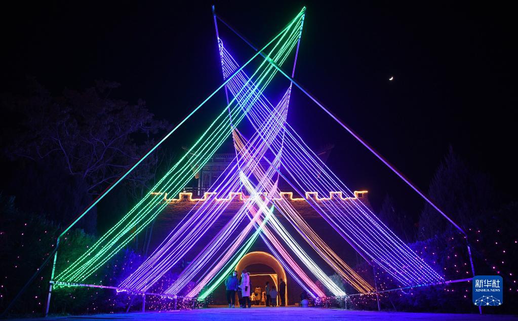 游客在銀川市黃河橫城旅游度假區觀看花燈展(2月5日攝)。