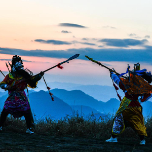 2月7日,龍里縣龍山鎮的年輕人在村子附近的山頂練習龍里太平花燈戲。