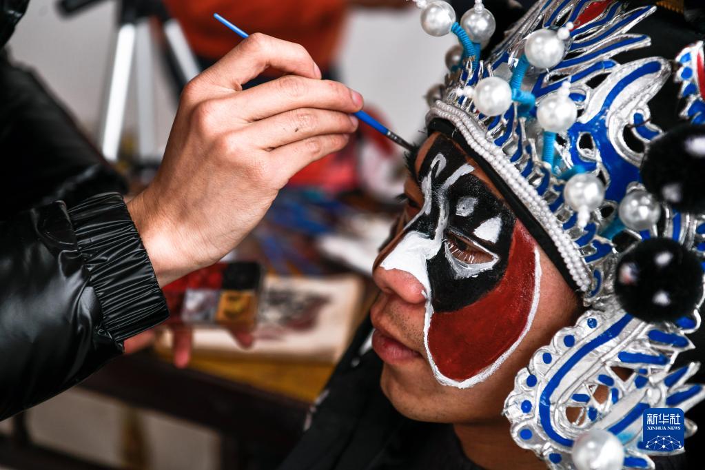 2月6日,龍里太平花燈戲的成員在表演前化裝。