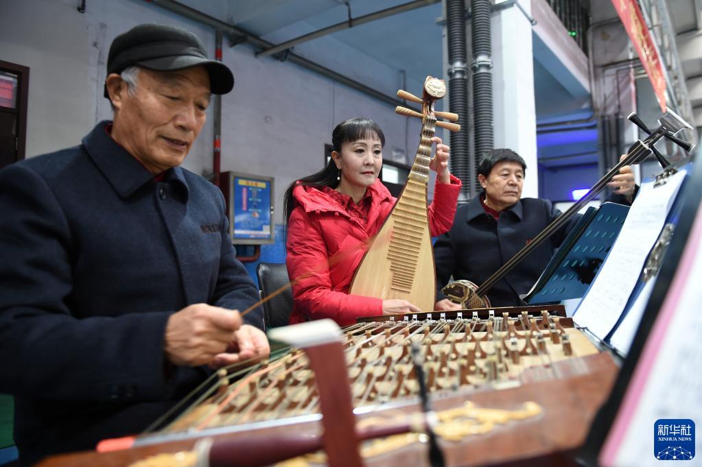 2月13日,在河北電機股份有限公司生產車間,石家莊市欒城區樓底農民工俱樂部成員在進行演出前準備工作。