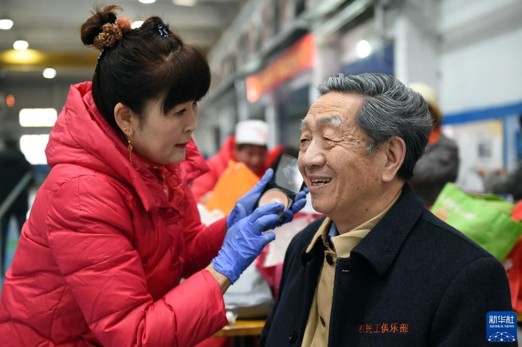 2月13日,在河北電機股份有限公司生產車間,石家莊市欒城區樓底農民工俱樂部成員在為李俊岐(右)化妝。